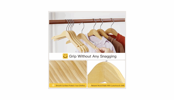 Convenient Swivel Hook & Grooves - Equipped with a rust-resistant, durable 360-degree hook allowing you to easily turn the hanger to any angle for picking up garment without even removing them from the clothing rack.These wood hangers have precisely grooves on each shoulder, be used to hang kids tank tops, dress,skirts tightly without sliping.