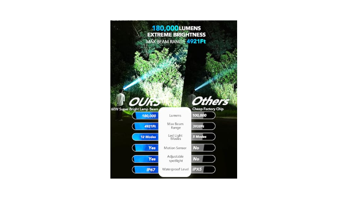 Stunning 180000 Brightness & 4921Ft Long Range: Worry-Free Purchase & Lifetime Warranty Included. Experience the power of our upgraded 180,000 LM LED vertical chips, illuminating your surroundings up to 4921 feet (about 1500 meters). Whether you\'re on a late-night hike or tackling challenging outdoor tasks, enjoy crystal-clear visibility while protecting your eyes with our energy-saving mode that activates after 10 minutes.