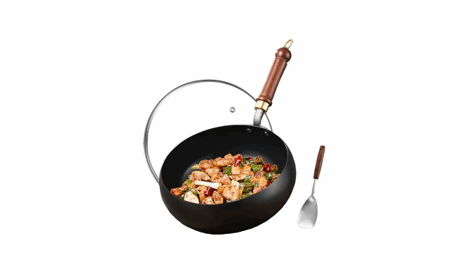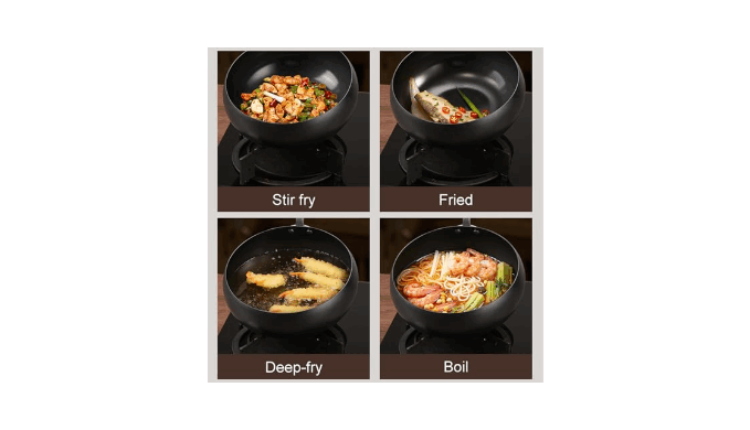 RAPID AND EVEN HEATING: The carbon steel material, combined with a wide flat-bottom design, ensures quick and even heating of the wok. This helps lock in the original flavors of the ingredients, making it ideal for frying and stir-frying.