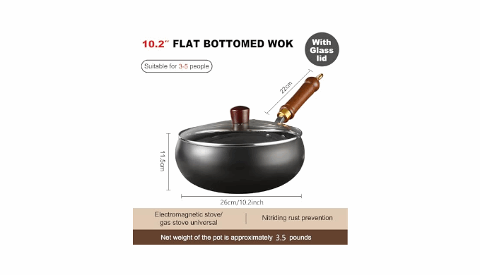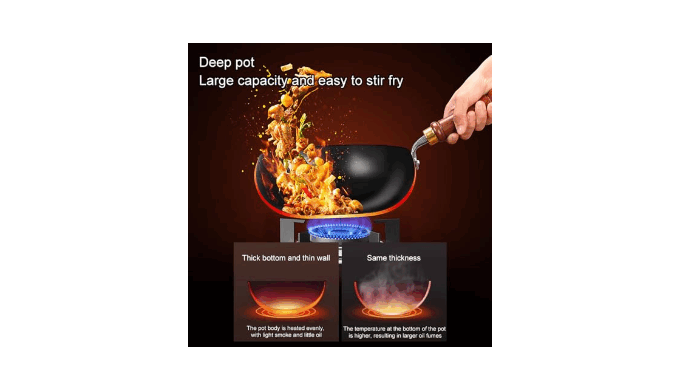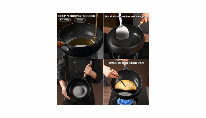 CARBON STEEL WOK PAN: This wok pan is forged from carbon steel, renowned as the best material for woks. It\'s pre-seasoned at high temperatures, using nitrogen treatment for outstanding durability, nitriding process makes it less prone to rusting. It boasts exceptional durability, making it a reliable choice for your kitchen.