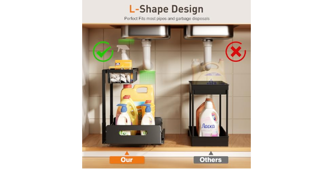 L-Shape for A Perfect Fit:Under sink storage rack is L-shaped to maximize space utilization. A narrowed top layer leaves room for the pipes to fit into the sink sewer, while the widened bottom layer houses more and taller bottles. Double the storage space in your cabinet or under the sink.