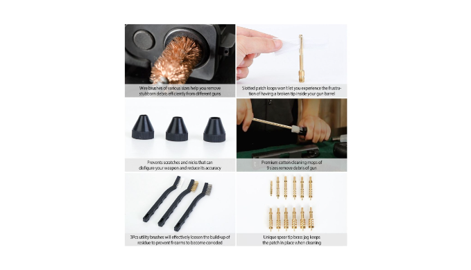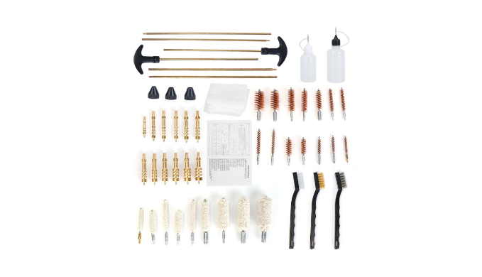 - Universal handle, universal handle for rifle/pistol rods, shotgun rods, rifle/pistol rods, various wire brushes, different cotton cleaning mops, slotted patch tips, accessory adaptors, cleaning patches, and muff guards