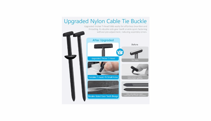 Quick Installation – Replace Traditional Fasteners in Seconds: Skip cable buckle ties or zipper clips—this universal clip threads onto any zip tie instantly. The double-side self-lock provides a tight, rattle-free hold for wires, tools, or cords