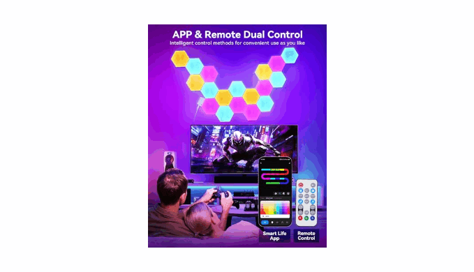 [Breathtaking RGB+IC Effect]: Hexagon lights adopt innovative RGB+IC LED chips for allowing you to independently control each light panel and set different colors for different light panel, creating personalized lighting effect for many scenarios such as living room, TV wall, gaming room, bedroom, home cinema and more, while the light has 16 million light colors which makes more stunning when compared with traditional RGB light