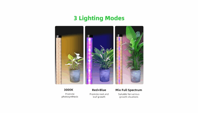 【Three Spectrum Modes for All Growth Stages 】This standing grow light features three customizable spectrum modes: 3000K Warm Light: Promotes photosynthesis and flowering. Red + Blue Light: Enhances root and leaf development. Full-Spectrum Light: Supports plants through all growth stages, from seedlings to maturity