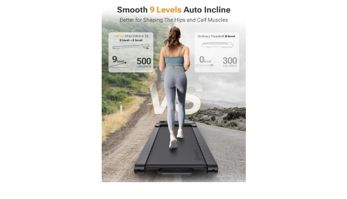Treadmill With Auto Incline: Spacewalk 3S walking pad treadmill features auto incline funtion with 9 incline levels.Simply press one key to invoke the automatic incline via remote control.