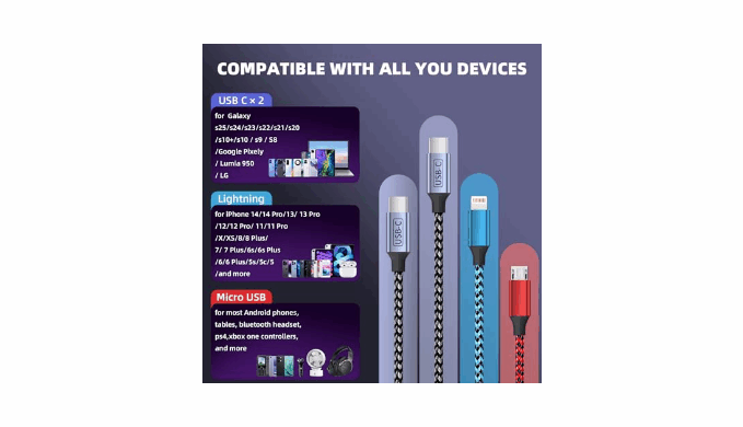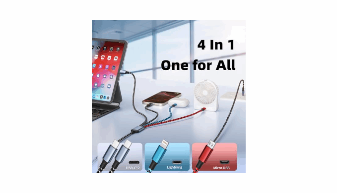 [Charger with Multiple Connectors Kit] The package includes 5FT 2-pack usb c 4-in-1 charging cable with dual type c ports to charge your devices at ease. In addition, this travel charger for multiple devices is also a warm choice for family/friends sharing/gift