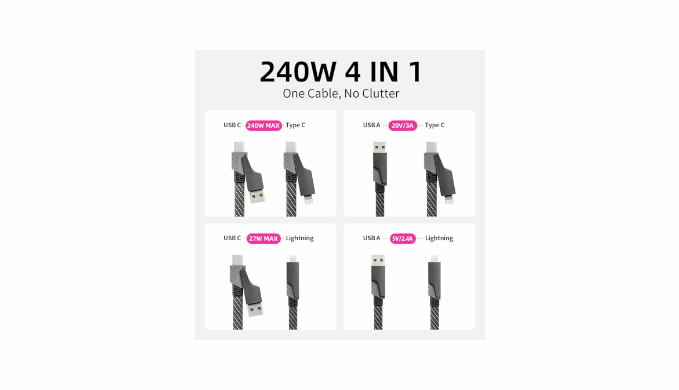 4 in 1 USB Charging Cable : This 4-in-1 USB-C fast charging cable covers all your charging needs with 1 USB-A port, 1 Light -ning port, and dual USB-C connectors cable. Compatible with almost all devices, one for all, no more need for other cables.