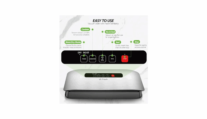 【Powerful Suction to Lock in Freshness】With an impressive 80kPa suction power, this vacuum sealer rapidly removes air to create a strong, airtight seal. The intelligent dry and moist modes provide a tailored sealing process for everything from steak and fish to marinated meals and dry snacks. It effectively preserves your food\'s flavor, texture, and nutrients, keeping it fresh for significantly longer