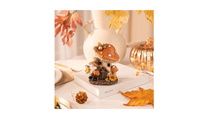 【Original Design】Valery Madelyn is a retail brand adhering to original designs. The house is designed to look like a mushroom with a thatched roof and a gnome standing outside. The gnome is holding a pumpkin and surrounded by fall items such as acorns and pumpkins. The house lights up at night, adding a warm and cozy glow to any space.