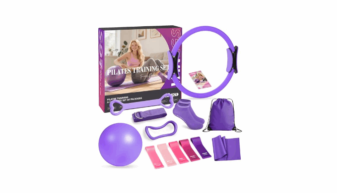 [All-in-One Pilates Kit for Women – Full Home Workout Solution] This complete home pilates set includes 13 essential pieces - 13\" pilates ring, 10\" exercise ball, figure 8 resistance band, stretching strap, yoga socks, resistance band, arm exerciser, 5-level resistance bands, and storage bag. It offers everything needed for an home pilates kit, making it ideal for at home workout equipment