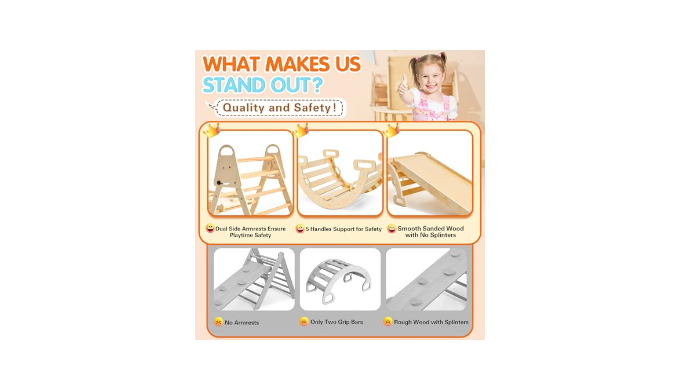 【SOLID WOOD & Eco-Friendly】:Built from premium, FSC-certified pine wood, our Baby Climbing Gym is both environmentally friendly and safe. Each component is meticulously polished and sanded, ensuring a smooth, durable surface. With no sharp edges or splinters, it\\\\\\\'s a safe haven for your child\\\\\\\'s playtime. This gym is a testament to our commitment to quality and safety.