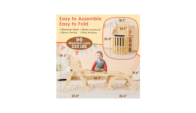 【Foadable & Easy to Store】:Our Toddler Climbing Set features a board at 36.2\\\\\\\"×16.3\\\\\\\" and an arch at 26.6\\\\\\\"×21.3\\\\\\\", both easily collapsible. The Triangle Set adjusts to 22.8\\\\\\\"×26.3\\\\\\\"×29.5\\\\\\\" and folds down with the turn of a knob. With the ease of folding and storage, parents can effortlessly move it to any corner or under furniture, making it a convenient and space-saving addition to any home.