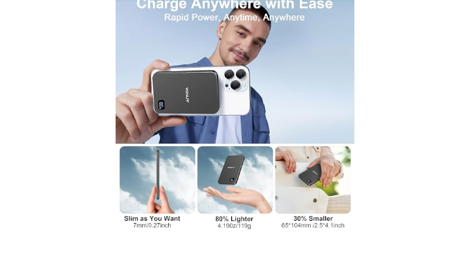 Sleek Metallic Design & Ultra-Thin Profile: Engineered for the modern, on-the-go lifestyle, this slim MagSafe power bank measures just 3.7 × 2.5 × 0.59 inches. Its compact, elegant metallic design slips easily into pockets or bags, ensuring you have reliable power at your fingertips wherever you go.