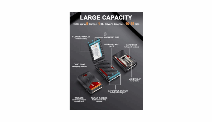Ultra-Slim Design - The slim wallet for men only 0.72\\\" thick and engineered with aerospace-grade aluminum alloy and microfibe leather, this minimalist wallet for men profile fits discreetly in front pockets or jeans. Features a pop-up card holder for 10-13 cards and a spring steel money clip for your bills, a metal wallet cuts bulk by 60% vs traditional leather wallets.