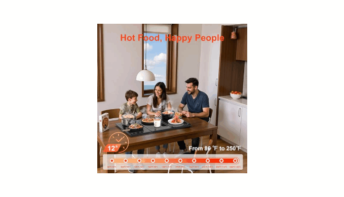 PRECISE TEMPERATURE MANAGEMENT: Exercise precise control over serving temperatures with our advanced food warming mat. It offers ten settings (86°F to 248°F) to perfectly maintain everything from delicate sauces to casseroles. A smart thermostat ensures consistent, even heat without hot spots. The 12-hour timer allows for worry-free warming, so your dishes stay perfect without drying out. Perfect for warm breakfasts or keeping dinner ready.