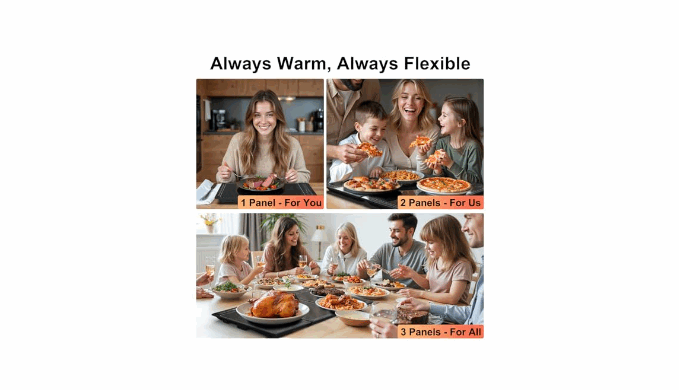MODULAR & FLEXIBLE DESIGN: Create the perfect serving space with our innovative modular food warming trays. Mix and match 1 to 3 removable panels to configure the ideal size for any occasion, from solo dining to parties. The space-saving design stores compactly, and the sleek profile blends with any table setting. From kitchen islands to dining tables, ensure everyone gathers around warm food.