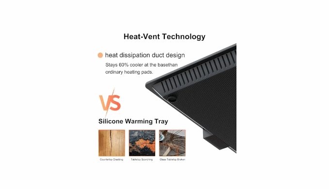 SAFETY ENGINEERING: Enjoy peace of mind with our comprehensive safety system integrated into this warming pads for food. Designed with your safety in mind, this warmer includes advanced overheat protection and a dedicated cooling system. The side ventilation effectively dissipates heat, reducing surface temperature and protecting your table—even during extended use.