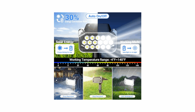 IP65 WATERPROOF & WEATHERPROOF: Constructed from high-strength ABS material - these solar spotlights waterproof operate reliably in temperatures from -4°F to 140°F. With an IP65 waterproof rating, such solar outdoor spot lights withstand harsh weather conditions, including rain, snow, frost, and high heat. Rain or shine, these solar lights outdoor waterproof ensure your garden, pathway, or landscape remains brilliantly illuminated all year round.