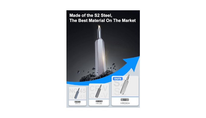 [Military - Grade Bits, Unmatched Quality] All bits are crafted from top - tier S2 steel. Compared to common steel, it\'s 30% harder and 40% more wear - resistant, featuring ultra - high hardness, toughness, and great wear - resistance. With advanced EDM cutting, bit accuracy error is under 0.01mm, doubling lifespan without harming screws. The strongly magnetized bits easily pick up and hold tiny screws, ensuring stable operation.
