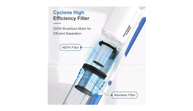 - Cyclone technology combined with a high-density filter on a cordless stick vacuum cleans up to 99.99% of fine dust particles and prevents secondary air pollution, providing you with an excellent cleaning experience. Note: filter can be washed and detached and there is an additional filter as a gift.