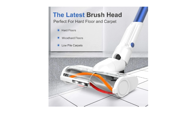 - The V-shaped roller brush combines rigid and soft bristles, making the vacuum cleaner excellent on hard floors and carpets. The LED electric brush head can clean up the dust, debris, and hair on the bottom of the bed, furniture, and dark places visually.