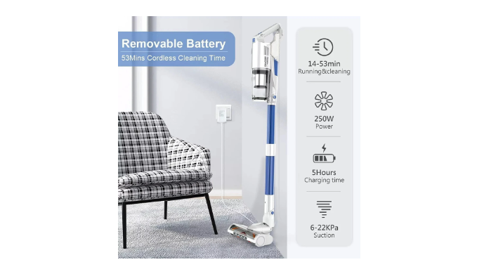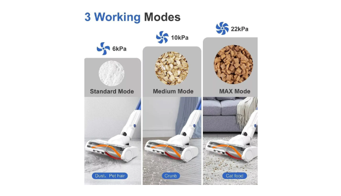 The upgraded 250W brushless motor cordless vacuum cleaner provides strong suction up to 22KPA. Three suction modes can be switched freely to meet your various cleaning needs (dust, pet, cats, debris, etc.) on hard floors, carpets, stairs, and cars. In addition, brushless technology brings less noise and a longer lifetime.