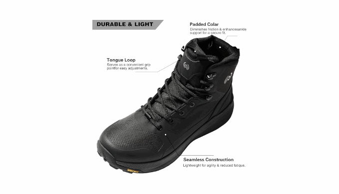 Durability & All-Around Protection Built with seamless 360° TPU (no weak stitches!) and reinforced lace eyelets that won’t rip. Weighs just 1.3lbs per boot — lighter than most work boots for men. The debris-blocking gusseted tongue keeps out gravel, while armor-grade toe caps and rubber heel guards protect against kicks and impacts.