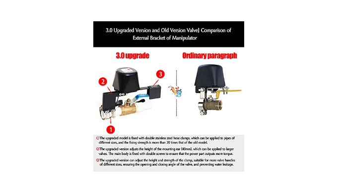 【Upgrade Smart Water Valve】Compared with ordinary water valves, the main feature of this upgraded version of smart water valve is that the control arm (rocker arm) and the installation arm are lengthened, so that the water valve can be installed more firmly on the ball valve. On the handle (only applicable to ball valves, applicable sizes: 1/2\\\", 3/4\\\", 1\\\" lever valve (1.5\\\" is not supported)