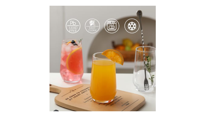 【Easy To Clean】: The highball glass set is crystal clear, not easy to retain stains, can be used as kitchen glasses, you can easily clean the glasses, easy to hand wash. Our cocktail glasses are also dishwasher safe, keeping your hands free.