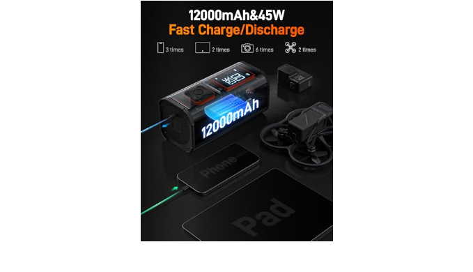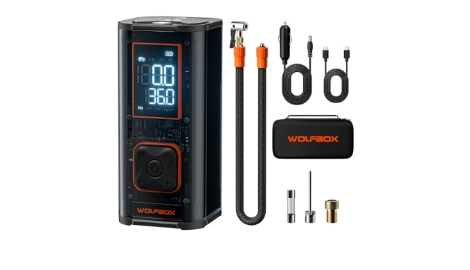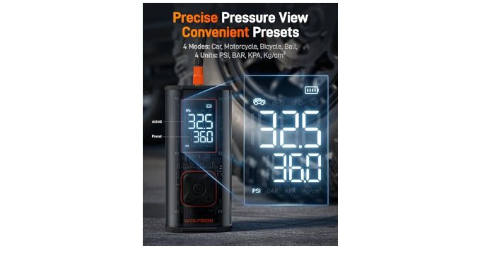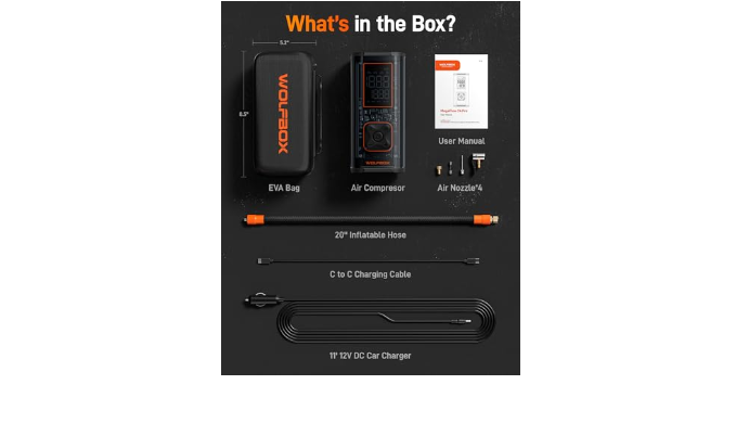 45W Quick Charge&LED light: The 45W USB-C interface fully charges the inflator in about 1 hour(Charger not included. Wolfbox Charger ASIN: B0D6BFFNKC.). Also features an LED light with lighting and SOS modes for nighttime emergencies. It can also charge your phone and other devices.