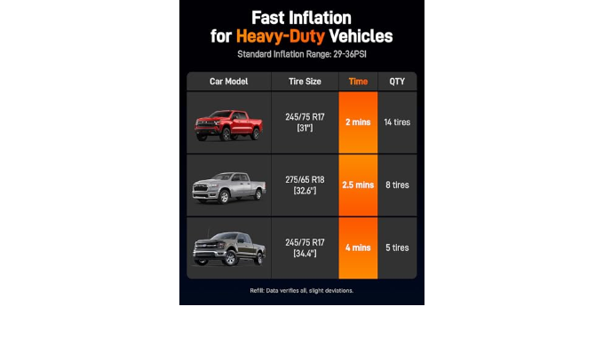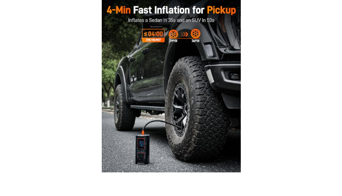 Large pump inflates a pickup truck tire in 4 minutes: The upgraded 58LPM dual-cylinder tire inflator can inflate a car tire (185/55/R14) in just 35 seconds, an SUV tire (225/45/R17) in 50 seconds, and a pickup truck tire (315/70/R17) in 4 minutes within the 29 PSI to 36 PSI range, the large air compressor can fill your tire in the time it takes to watch a short video.