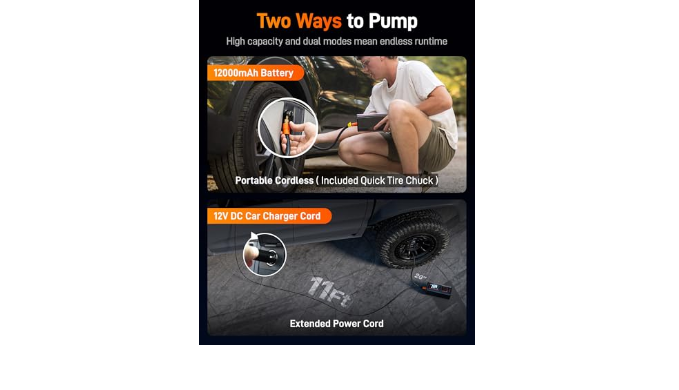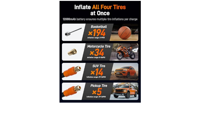 12000mAh&150PSI Ton of usage times:With a 12000mAh (44.4WH) battery and 150 PSI max pressure, this air compressor can inflate 20 small car tires (185/55/R14), 14 medium SUV tires (225/50/R17), or 5.5 large truck tires (315/70/R17) from 29 to 36 SI on a single charge, Top up all four tires of any family car in one go