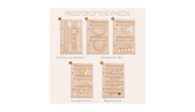 【Customizable Pages】Features 5 loose-leaf pages with durable metal binder rings. Includes 1 page for large grids, 2 pages for medium grids, 1 page for small grids, and 1 page for extra small grids. Designed to accommodate various types of jewelry, perfect for 5-7 days of travel or everyday use.