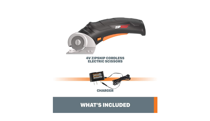 (1) 4V ZipSnip Cordless Electric Scissors, (1) Cutting Blade, (1) 4V Battery Charger