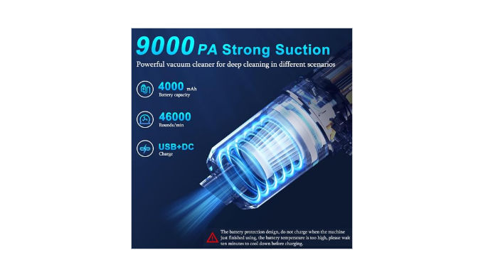 【USB Rechargeable and Cordless】Our small vacuum cleaner has built-in 4000mAh lithium-ion battery(2 x 2000mAh battery packs) which can bring more suction power, and adopts 5V/2A adapter can quickly fully charge in 2.5-3 hours. The cordless handheld vacuum design allows you to move freely while cleaning your stairs, kitchen, car or hard-to-reach corners. You can place this portable vacuum cleaner in any storage space.