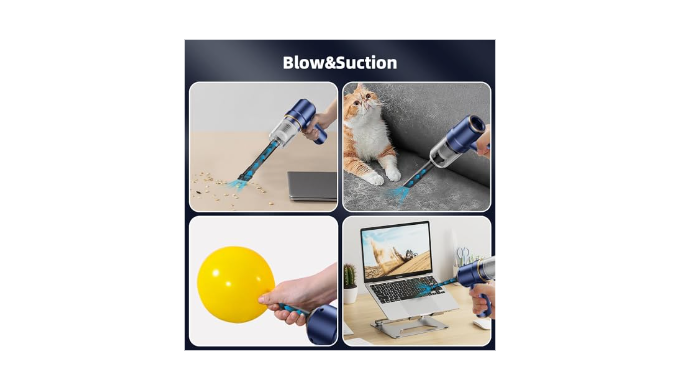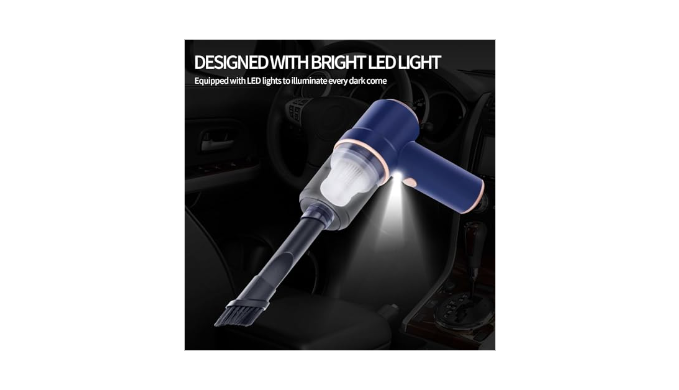 【2 In 1 Handheld Vacuum5 Accessories Available】An extended nozzle is suitable for cleaning desks, doors, windows, cars, and sofa corners; A brush is suitable for sucking and wiping carpet, curtains, etc. 3 kinds of nozzles to choose from, to inflate/pump for small equipment The vacuum has a smart design, the front end can vacuum while the rear end can blow dust, which gives you efficiently cleaning experience. Our mini vacuum has suction up to 4500PA, which is enough to meet your cleaning needs for dust, pet hair and some difficult-to-clean debris in the car or home. The cordless vacuum also has an LED light, it allowing you to easily clean dark corners