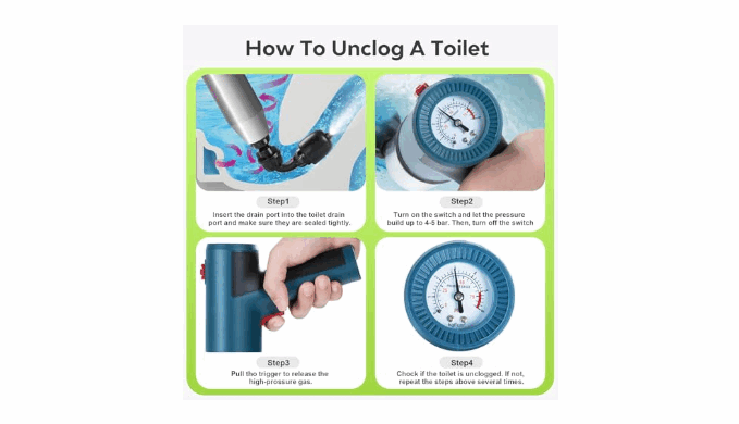 【Powerful Electric Toilet Plunger】Our air pressure unclogger features a built-in electric air pump that inflates the device at the push of a button, reaching 5 Bar in just 20-30 seconds. Say goodbye to the hassle of manual pumping