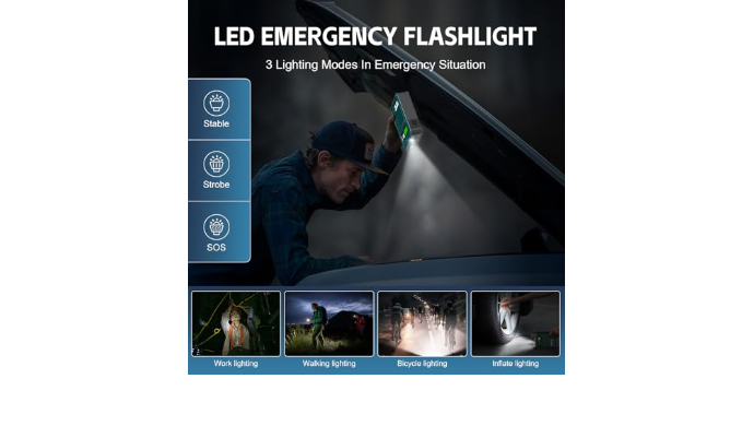 Portable & Multifunctional: Designed with 1 USB output port (5V/2.1A), the USB port can fully charge mobile phones, tablets, and other mobile devices at the fastest speed; the car jump pack LED work light has three modes: flashlight, strobe light, and SOS light. This multi-purpose portable jump starter weighs only 635g, suitable for camping, outdoors, indoors, emergencies, travel, and other uses
