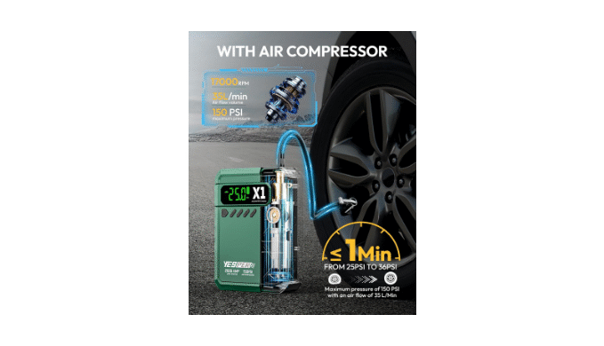 3+4 Air Compressor with Car Jump Starter: YESPER X1 battery jumper starter portable can quickly inflate car tires to 30 PSI in just 3 minutes, unique turbocharged 35L/Min (150 PSI) lasting 25 minutes. 3 different nozzles& 4 Preset Modes can be used to inflate SUVs, cars, bikes, balls, etc. Equipped with Smart preset & AUTO-STOP. LCDs show the remaining power and working status. Because of the AUTO-STOP function, you never have to guess the exact amount of power left and over-inflate