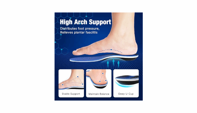 ERGONOMIC 3-POINT SUPPORT DESIGN: Orthotics inserts feature a “three-point mechanical support” structure that supports the forefoot, arch, and heel for men and women. Gel pads absorb shock and reduce pressure, while the U-shaped deep heel cup locks the heel for stability, preventing sprains and enhancing comfort during every activity