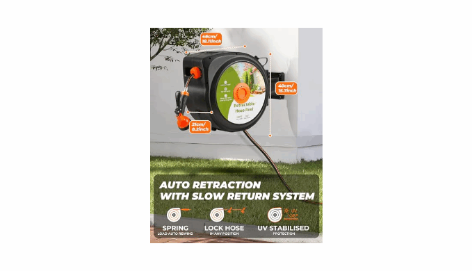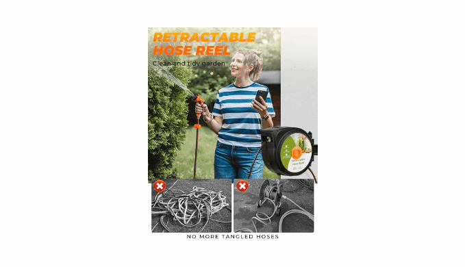 【Effortless Auto-Retract System】Say goodbye to manual winding—this retractable hose reel smoothly pulls back your hose with a gentle tug, thanks to its auto rewind mechanism that prevents tangles and kinks to save your effort and timing.