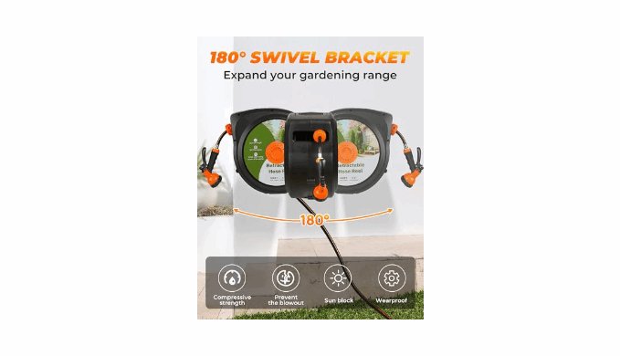 【Wide Coverage】Includes a 100 ft hose reels for outside and a 180° swivel bracket, allowing you to lock your 1/2-inch hose at any desired length for precise watering of your garden, patio, or driveway.