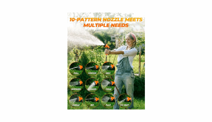 【10 Adjustable Spray Patterns】Switch seamlessly among 10 spray modes—from jet and mist to shower and cone—tailored for watering flowers, lawns, floors, or even for car washing and pet bathing. The ergonomically designed nozzle ensures both comfort and control.