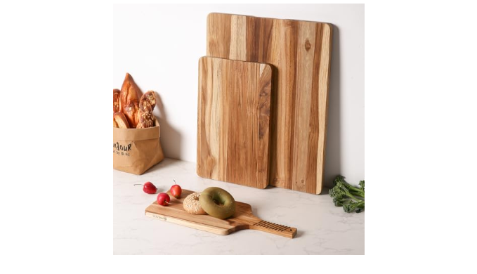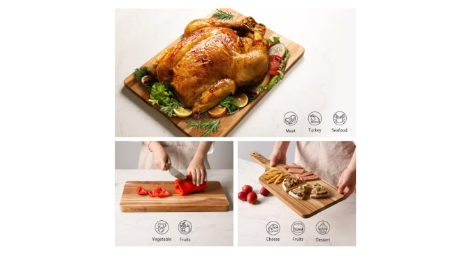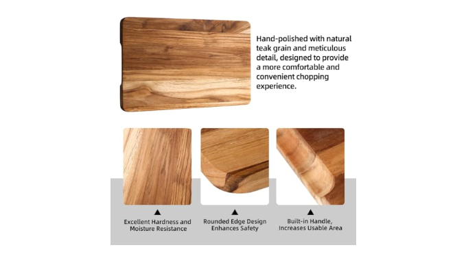 Versatile Size Design: This 3-piece teak soild cutting board set is perfect for handling a variety of ingredients. The large board is great for cutting large meats like turkey and steak, the medium board is ideal for vegetables and fruits, and the small board is perfect for daily plating or afternoon tea. It easily adapts to different tasks.