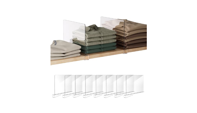 MULTI FUNCTIONAL PARTITION BOARD - You will receive 8 x Shelf Dividers For Closet Organization (Crystal-Clear), which are perfect for organizing your wardrobe, kitchen, bathroom, office, and more. They organize items such as clothing, bags, kitchenware, seasonings, towels, books, files, etc. neatly and keep them upright when needed, maximizing storage space
