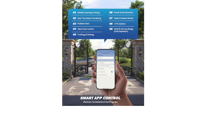 Zumi-Exclusive Security: Our automatic gate opener uses exclusive 128-bit rolling code technology to ensure activation only by authorized remotes, keypads, and vehicle sensors, with real-time gate status monitoring through the app for enhanced 24/7 home protection