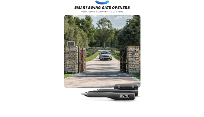 Access Your Property with Ease: Zumi\'s swing gate opener handles gates up to 20 ft. long and weighing up to 900 lb., with app control and remote controls offering convenient, hands-free gate access