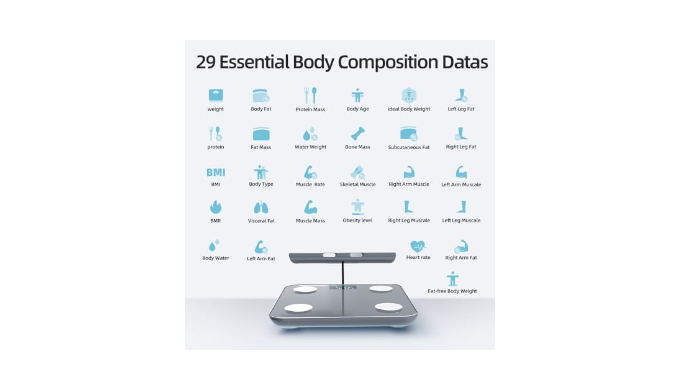 29 Essential Body Composition - The smart scale not only shows weight but also BMI, body fat, subcutaneous fat, body water, protein, BMR, body age etc., by electrical Bio-Impedance Measurement Technology. The data will sync to the app when your phone and scale connect successfully. It makes you know more data clearly about your body in time and track progress easily on your phone.